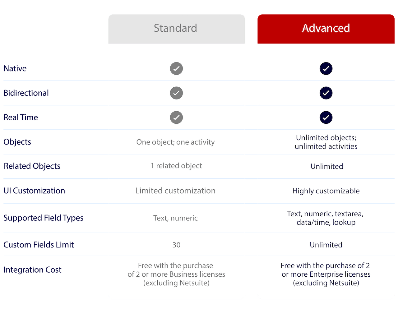 With our Advanced Integration, you can sync unlimited CRM objects and unlimited related data.