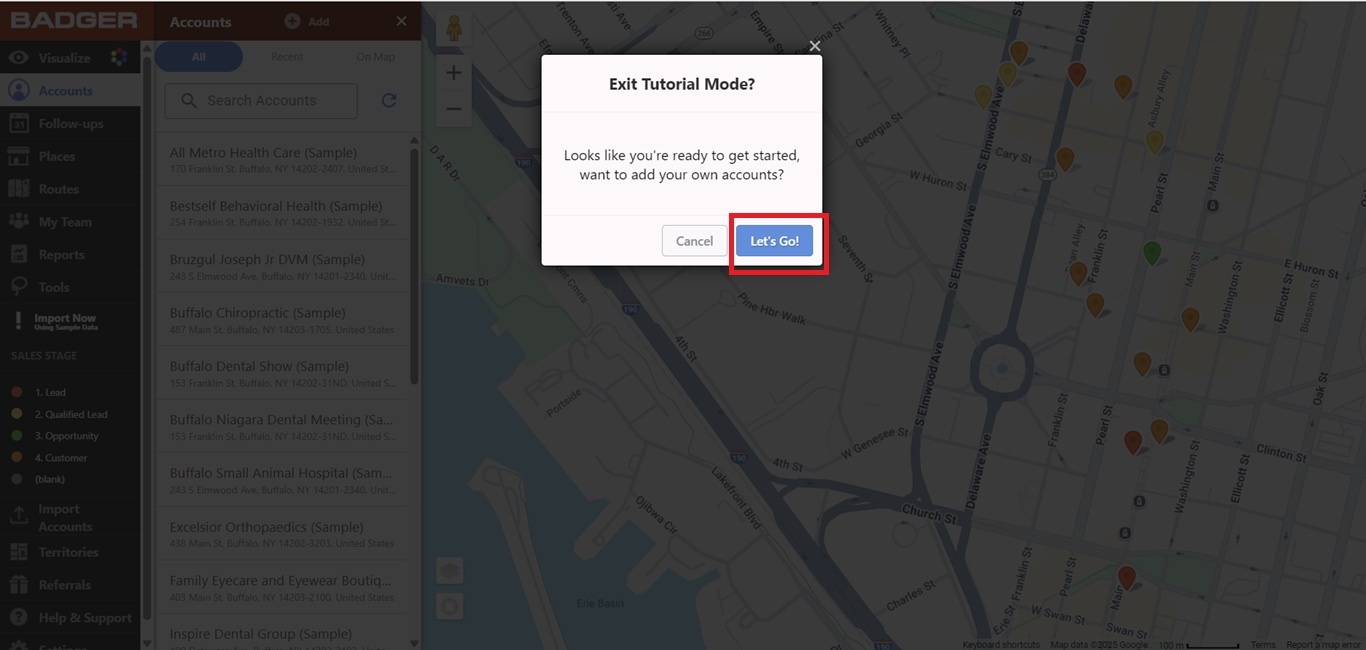 2. An Exit Tutorial Mode? box will pop up. Click on Let’s Go!, and you’re ready to upload your spreadsheet, or manually create accounts.
