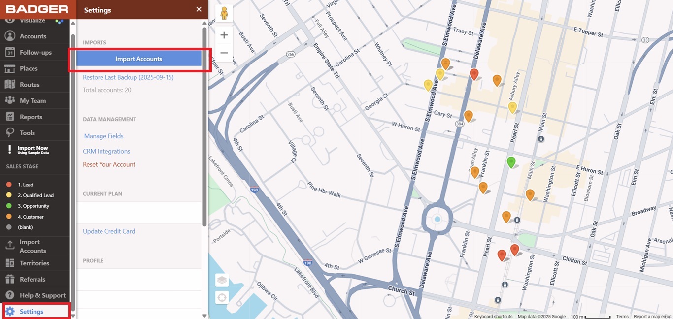 2. Or, directly importing your spreadsheet through the Import Accounts menu or the Settings button.