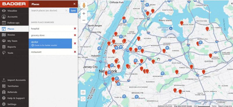 The “Places” tool finds new contacts on your map by keywords. This can be anything from local coffee shops, a gas station to potential leads. The places tool is ideal for adding in pit stops into your route or as a lead generation tool to find new leads around your territory to add into your route.